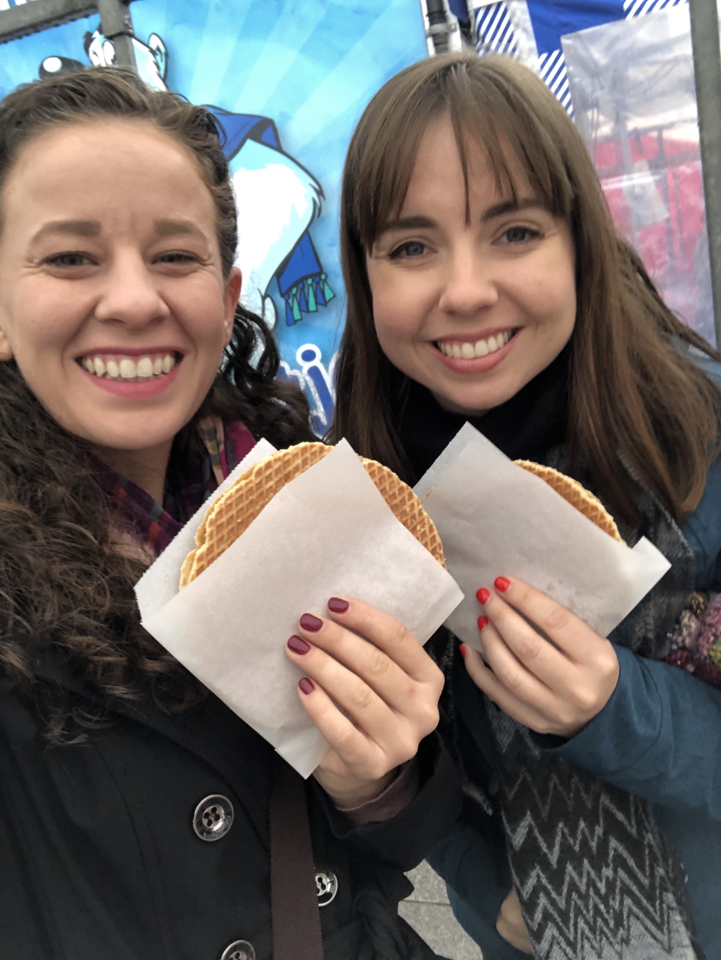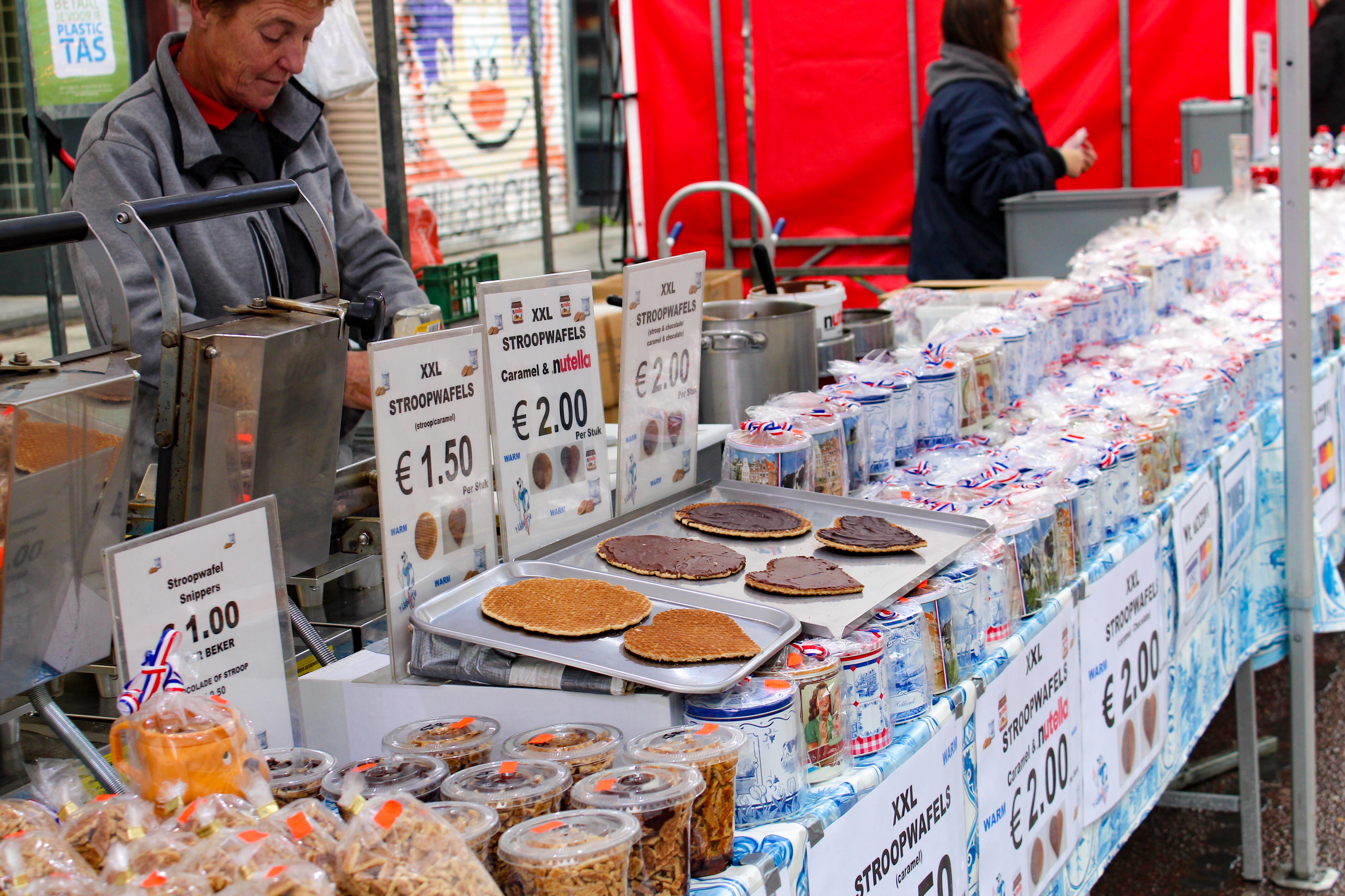 We did a lap around the market, huddled together under a single umbrella before stopping for some souvenirs and then the coveted Stroopwafel. We purchased our stroopwafels for 1.50 Euros and then ate them under an easy-up to escape the rain. Our stroopwafels were made as we ordered them. The fresh waffle batter was ladled onto the waffle press and in about a minute it was finished and promptly covered in gooey melted caramel and topped with another waffle. The waffles are thin, imagine the thickness of a crepe vs a pancake. You can also have your waffle made with Nutella or chocolate but I opted for the original version. I wouldn’t recommend this for breakfast as it’s VERY sweet. But, if you visit Amsterdam you have to try it.