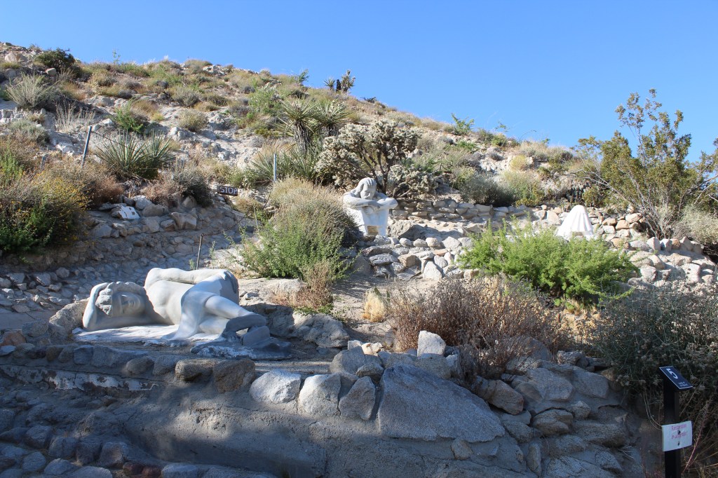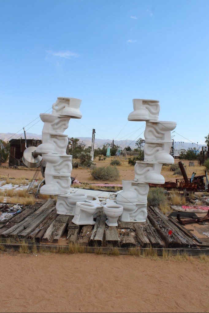 We traveled to Noah Purifoy’s Outdoor Museum in Joshua Tree next. Noah Purifoy created this museum out of found items. His sculptures and art, found off a dirt road in a suburban area, are free to visit. His art is exciting and thought-provoking. Each piece is different, eliciting strange and wonderful responses as you view them. My favorites were the TV set piece, the “Gallows” and the toilets all set up together. This art museum is one of the more interesting that I’ve been to in my life. It’s for the curious and the interesting. Don’t visit expecting to understand everything, we certainly didn’t. Go to see something new and be inspired.