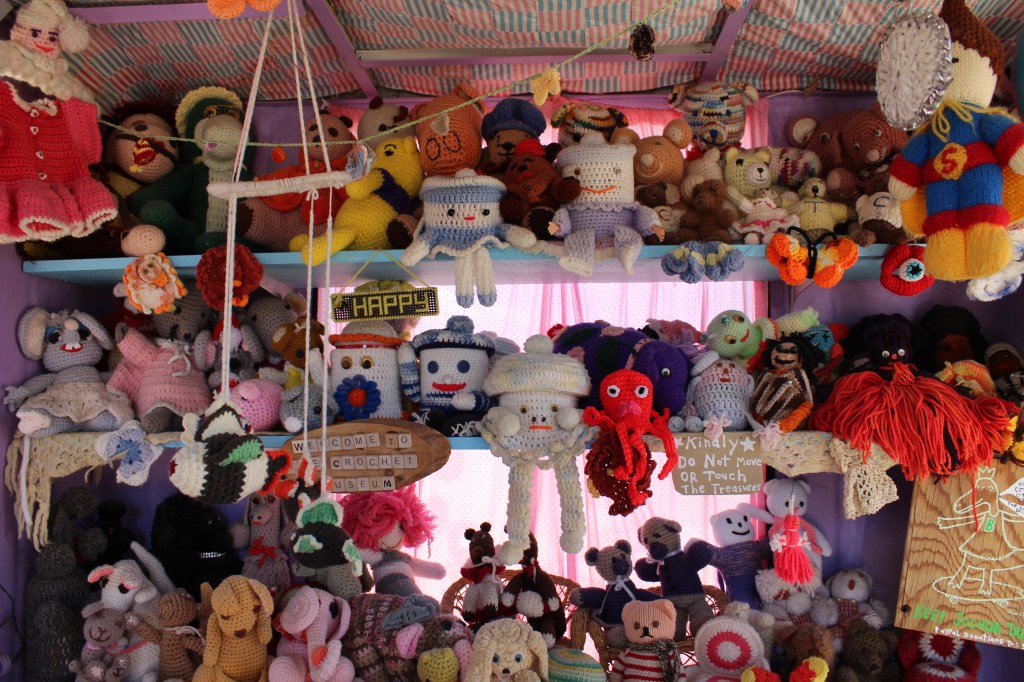 Based on the recommendation of our tablemates at Pappy and Harriet’s we visited the Art Queen Gallery in Joshua Tree. It’s another example of that strange desert art style that is really unique to the location. Art Queen is a collaborative gallery put together by several artists. Here we viewed an array of repurposed and redesigned clothing items, paintings, and handmade decor. The outdoor gallery is home to the “World Famous Crochet Museum” a museum inside of an old 24 hr photo hut that is positively filled with crocheted items. This place is unique and really transcends description. We laughed about some of the NSFW art we found as we roasted inside the glass gondola in the mid-morning sun.