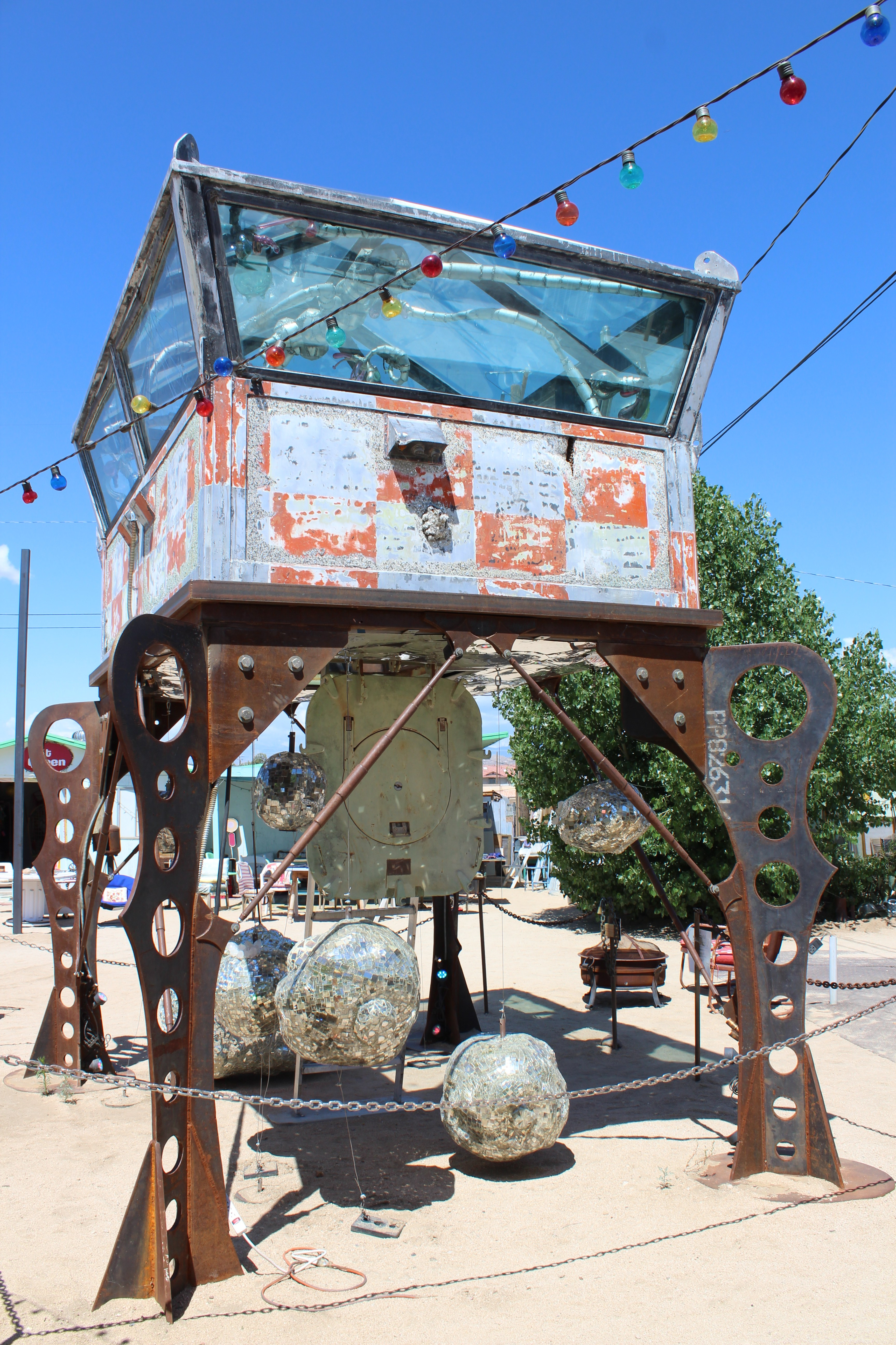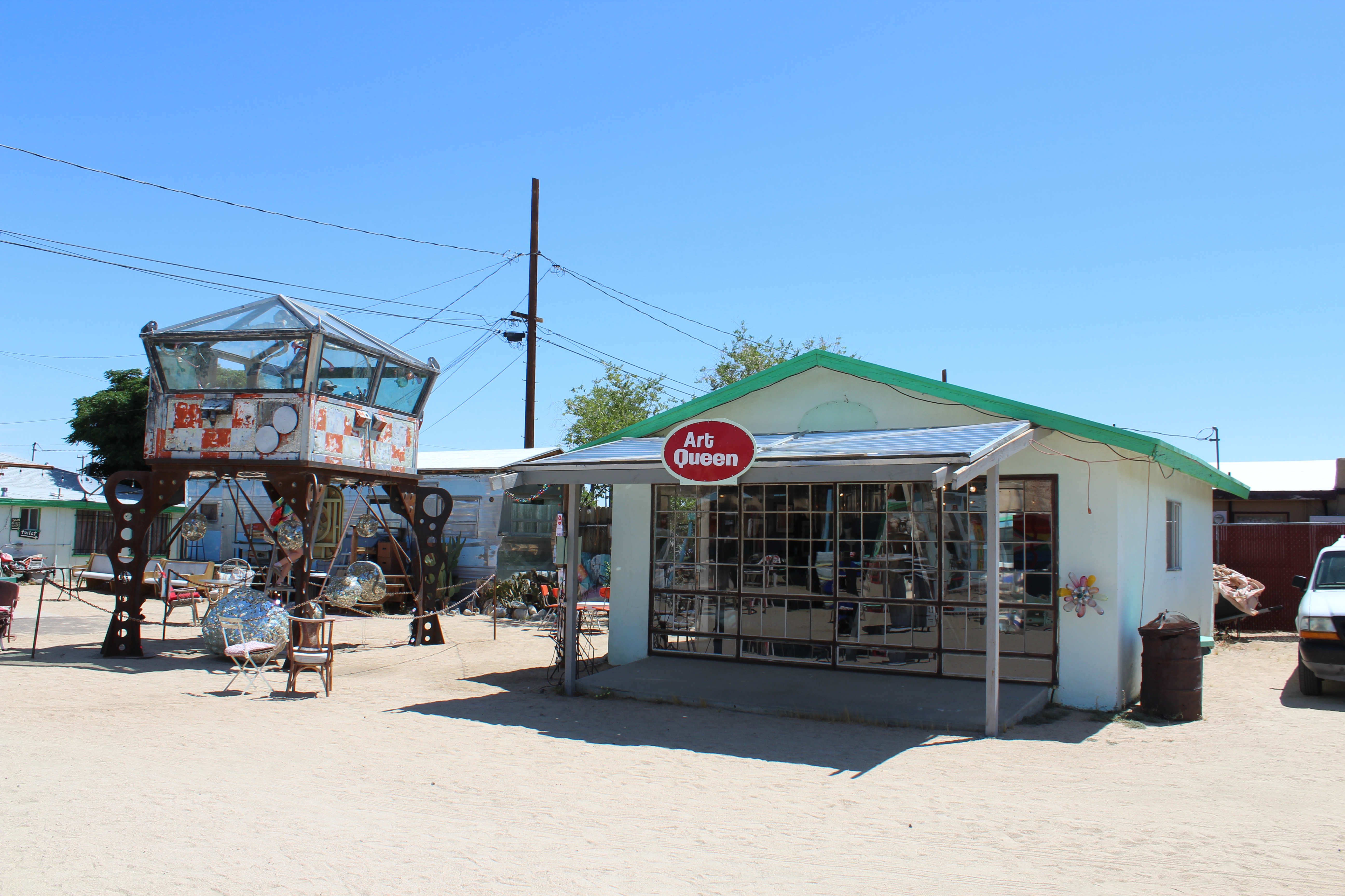Based on the recommendation of our tablemates at Pappy and Harriet’s we visited the Art Queen Gallery in Joshua Tree. It’s another example of that strange desert art style that is really unique to the location. Art Queen is a collaborative gallery put together by several artists. Here we viewed an array of repurposed and redesigned clothing items, paintings, and handmade decor. The outdoor gallery is home to the “World Famous Crochet Museum” a museum inside of an old 24 hr photo hut that is positively filled with crocheted items. This place is unique and really transcends description. We laughed about some of the NSFW art we found as we roasted inside the glass gondola in the mid-morning sun.
