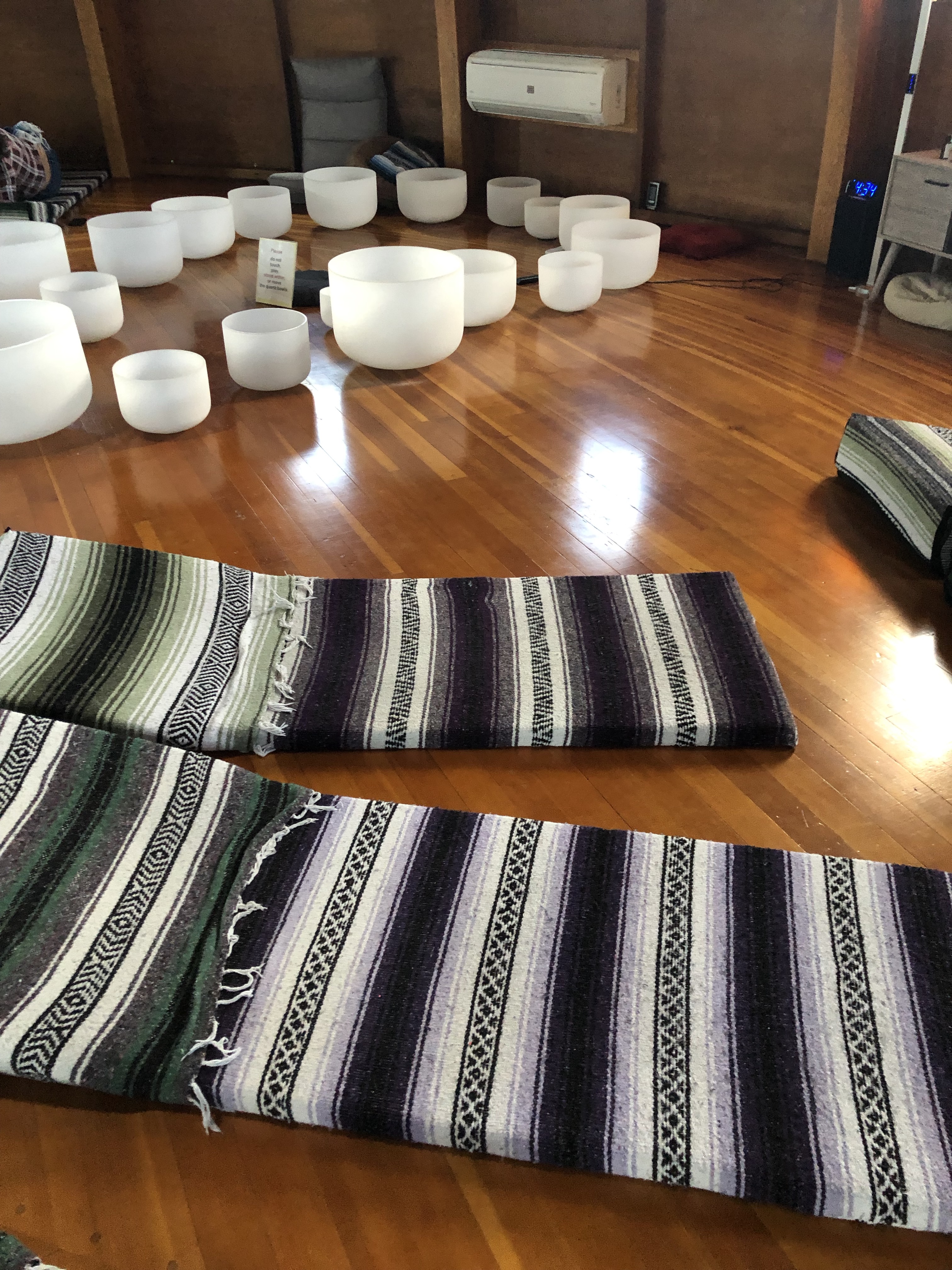 After checking in you are free to relax in a hammock or around a table with your friends until they call your time slot. Once inside the spaceship-like building, you begin by leaving your shoes downstairs and ascend up a tall, nearly vertical staircase into the sound room. Then you pick a mat and prepare for a world of the mysterious. The host shares an introduction to the building and the sound bath before playing the crystal bowls. It is loud. You can feel the sound in your body. Each bowl is tuned to the chakras and is supposed to help you stop thinking about meditation and relax the brain. It works. For someone who prior to this trip had a very hard time meditating I found myself lost in the sounds and feeling of my body rather than in my head.