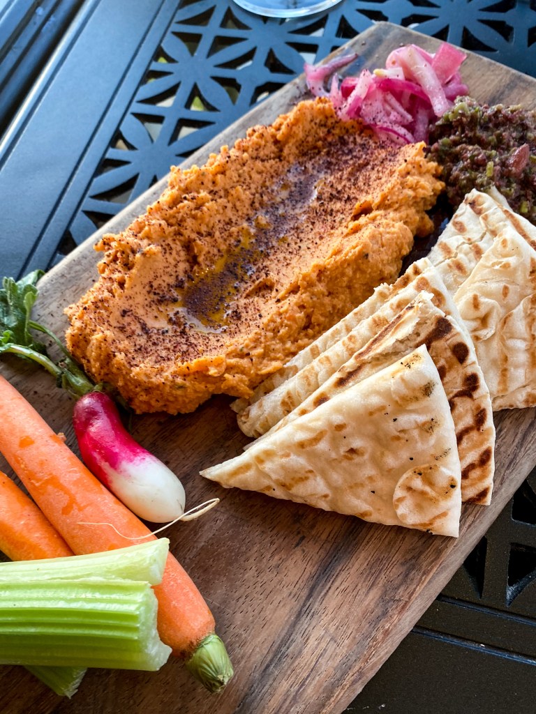 Order the Sumac Hummus and Olive Tapenade as a starter. It’s served with pickled onions, grilled pita bread, and raw veggies, it’s vegan and so worth it. We were fighting over it at dinner.