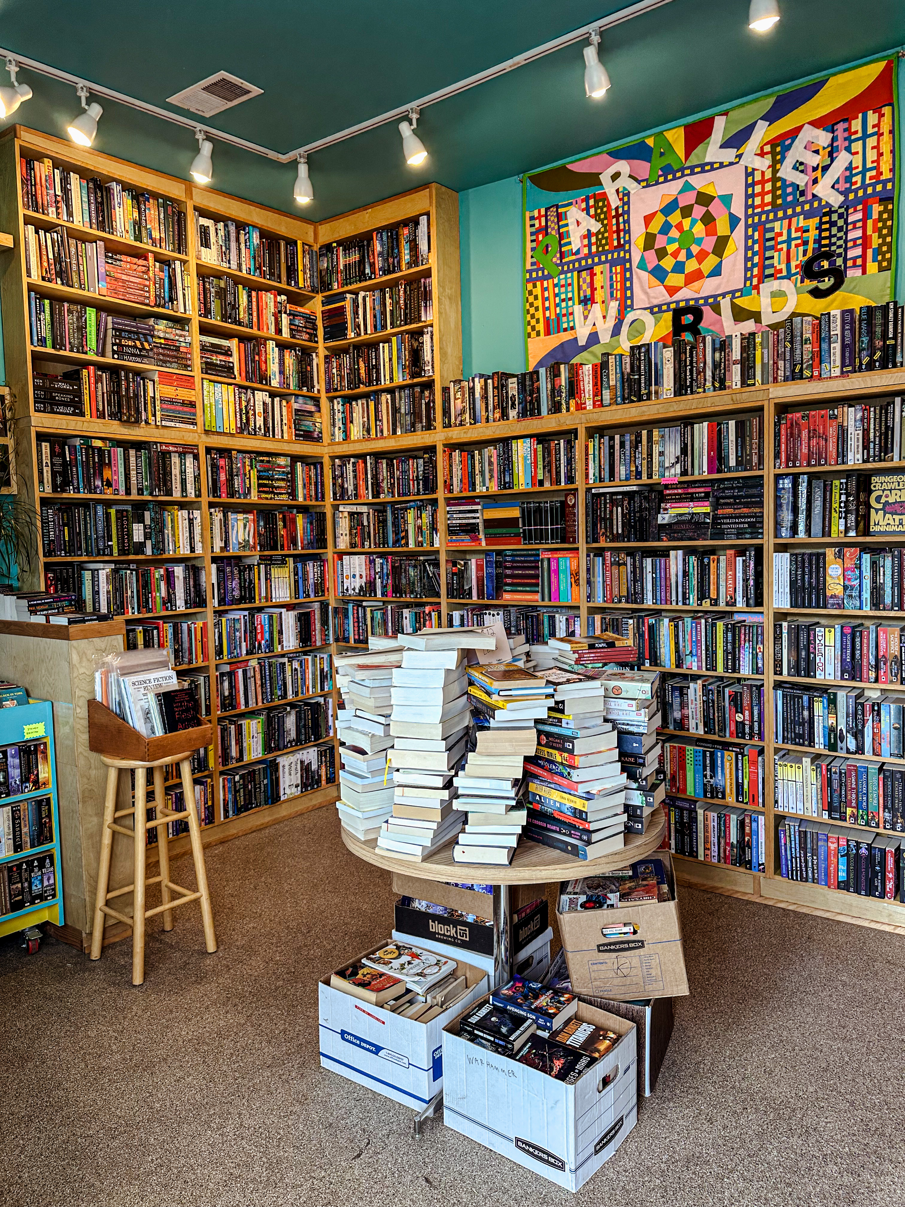 Parallel Worlds is a cozy but well-stocked bookshop with just about every science fiction and fantasy title you imagine. Stop here for new and used titles ranging from recent hits to cult classics. This colorful bookstore has books lining nearly every inch of available space and though it may be tiny it’s mighty. The staff here is super friendly and the art taking up the book-lined space is so fun!